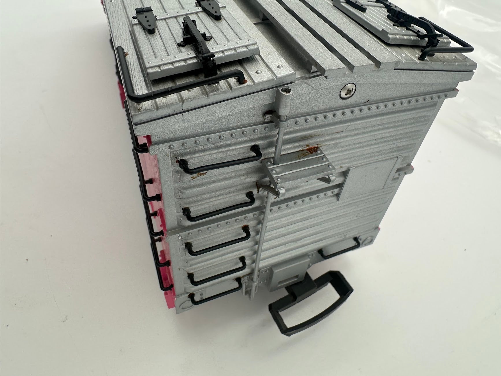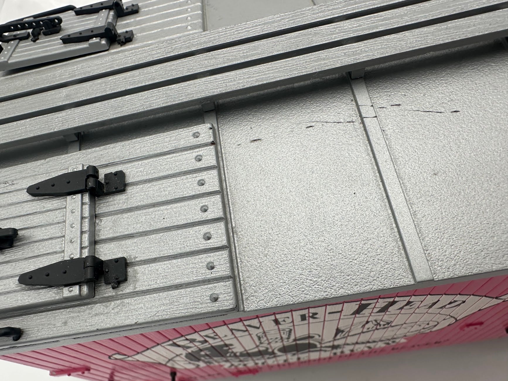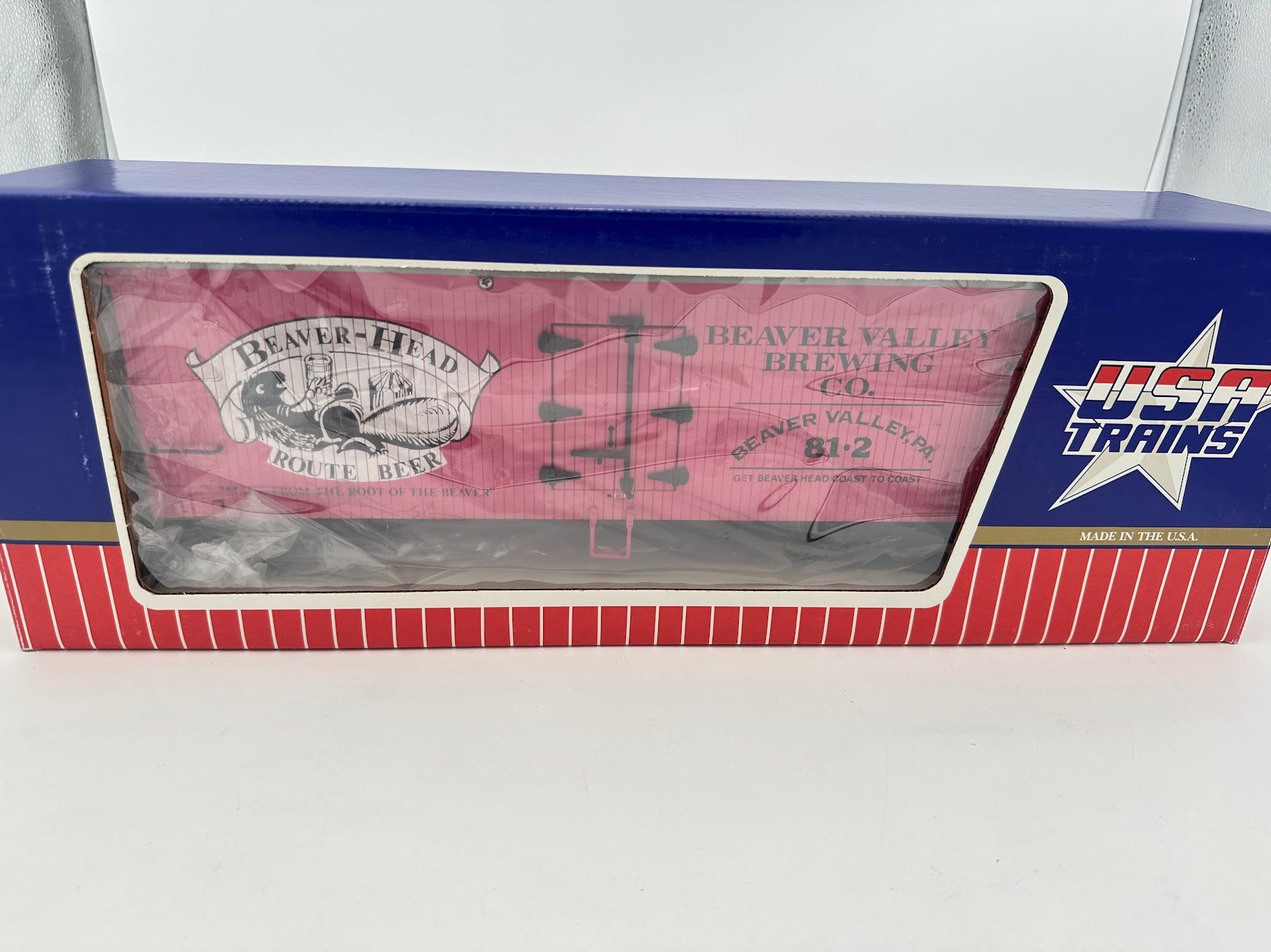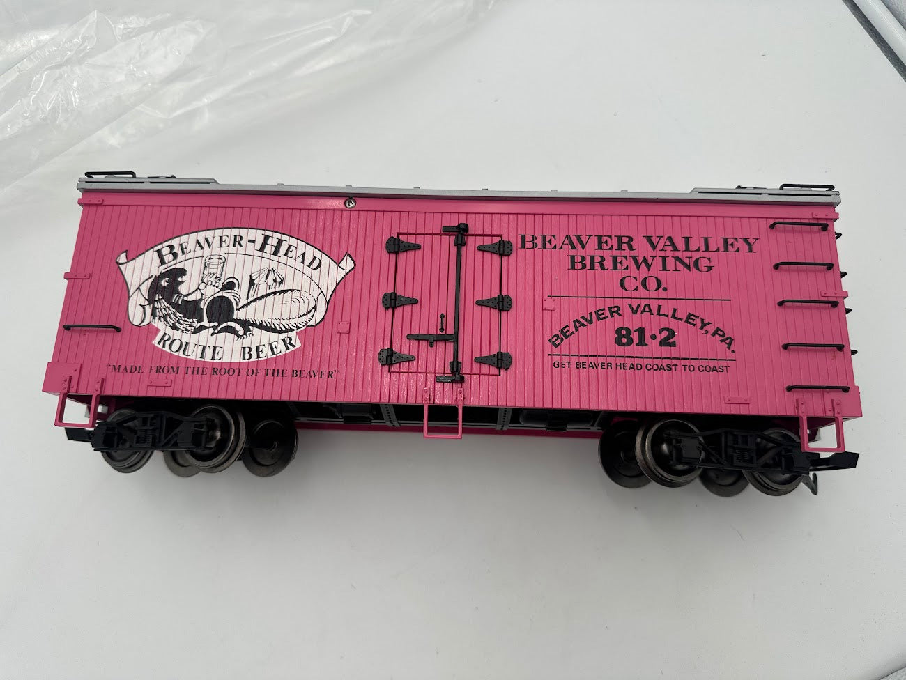 USA Trains Beaver Valley Brewing Company Reefer Pink Boxcar with Metal Wheels - Limited Run - comes exactly as pictured. This is from Al's personal collection and was on his G Scale wall display. I believe he designed this one himself and had it manufactured at USA. One reefer step is broken. Comes in a USA Trains Box.