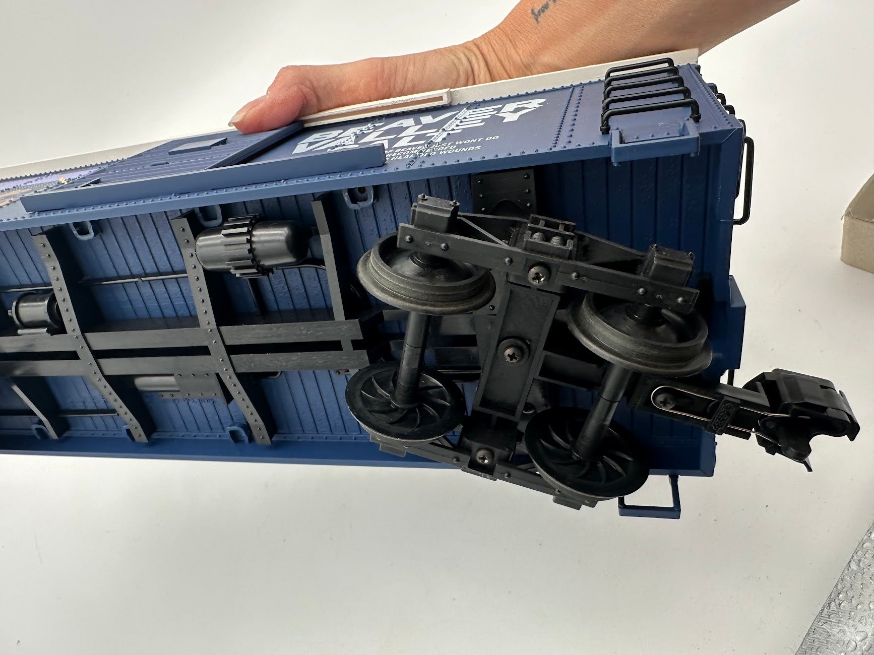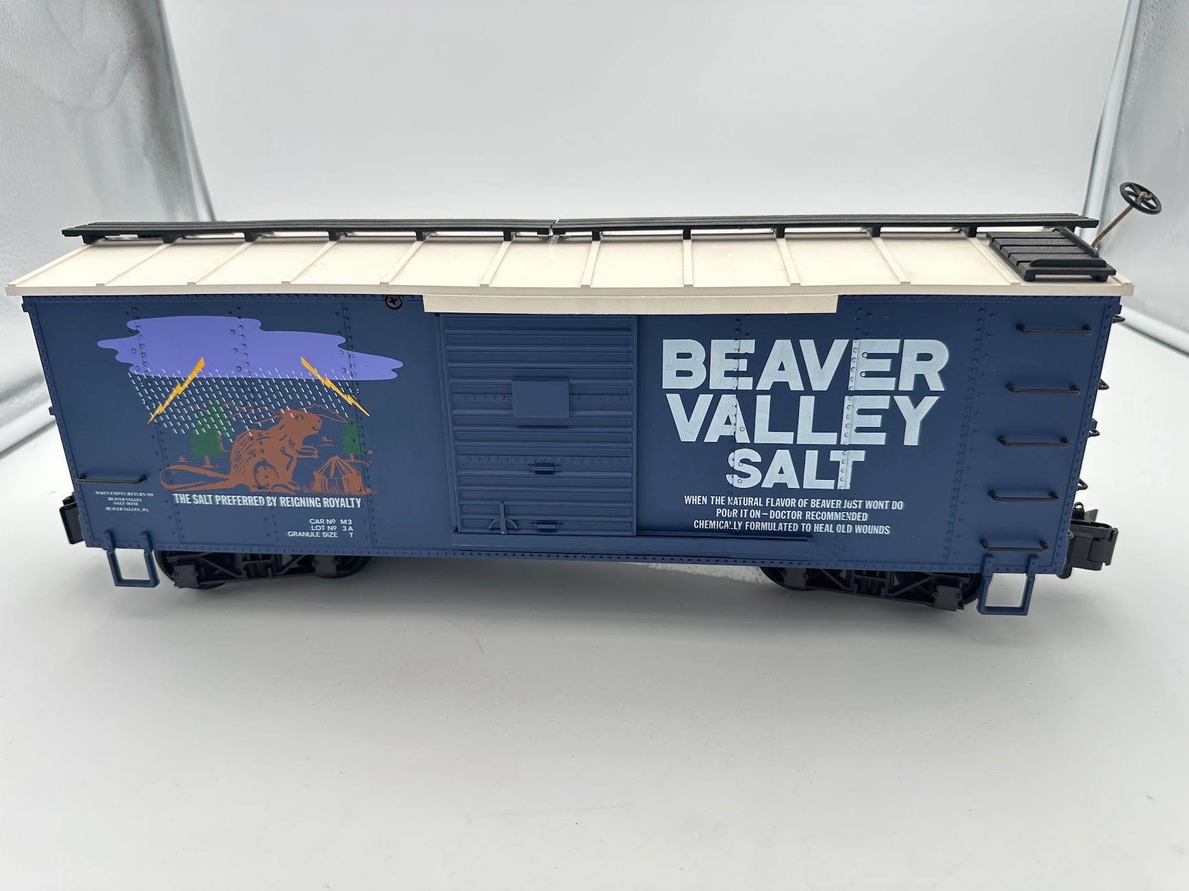 USA Trains Beaver Valley Salt Blue Reefer Boxcar - Limited Run - comes exactly as pictured. Brake wheels is slightly bent. This is from Al's personal collection and was on his G Scale wall display. Comes in a USA Trains Box.