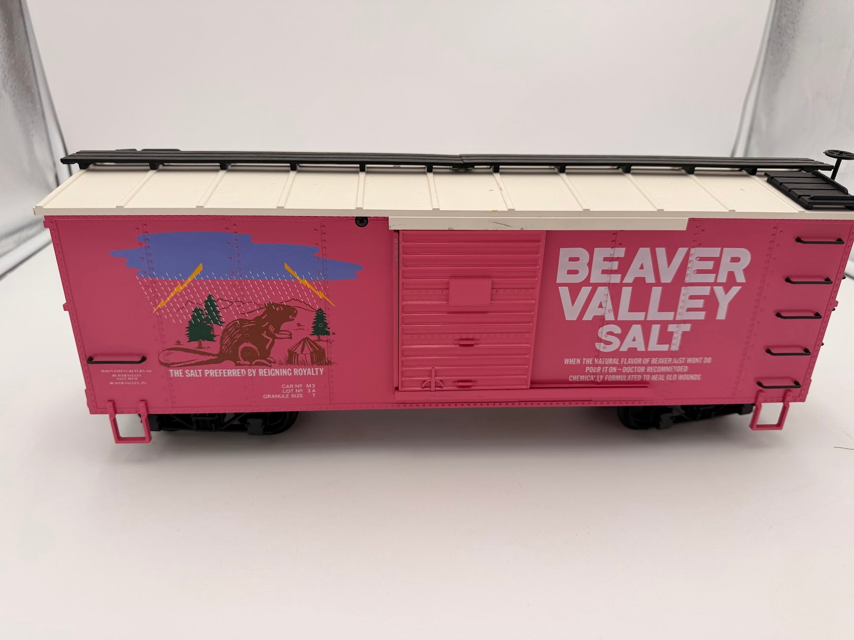 USA Trains Beaver Valley Salt Pink Reefer Boxcar - Limited Run - comes exactly as pictured. Brake wheels is slightly bent. This is from Al's personal collection and was on his G Scale wall display. Comes in a USA Trains Box.