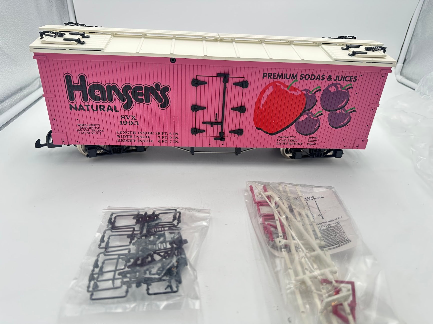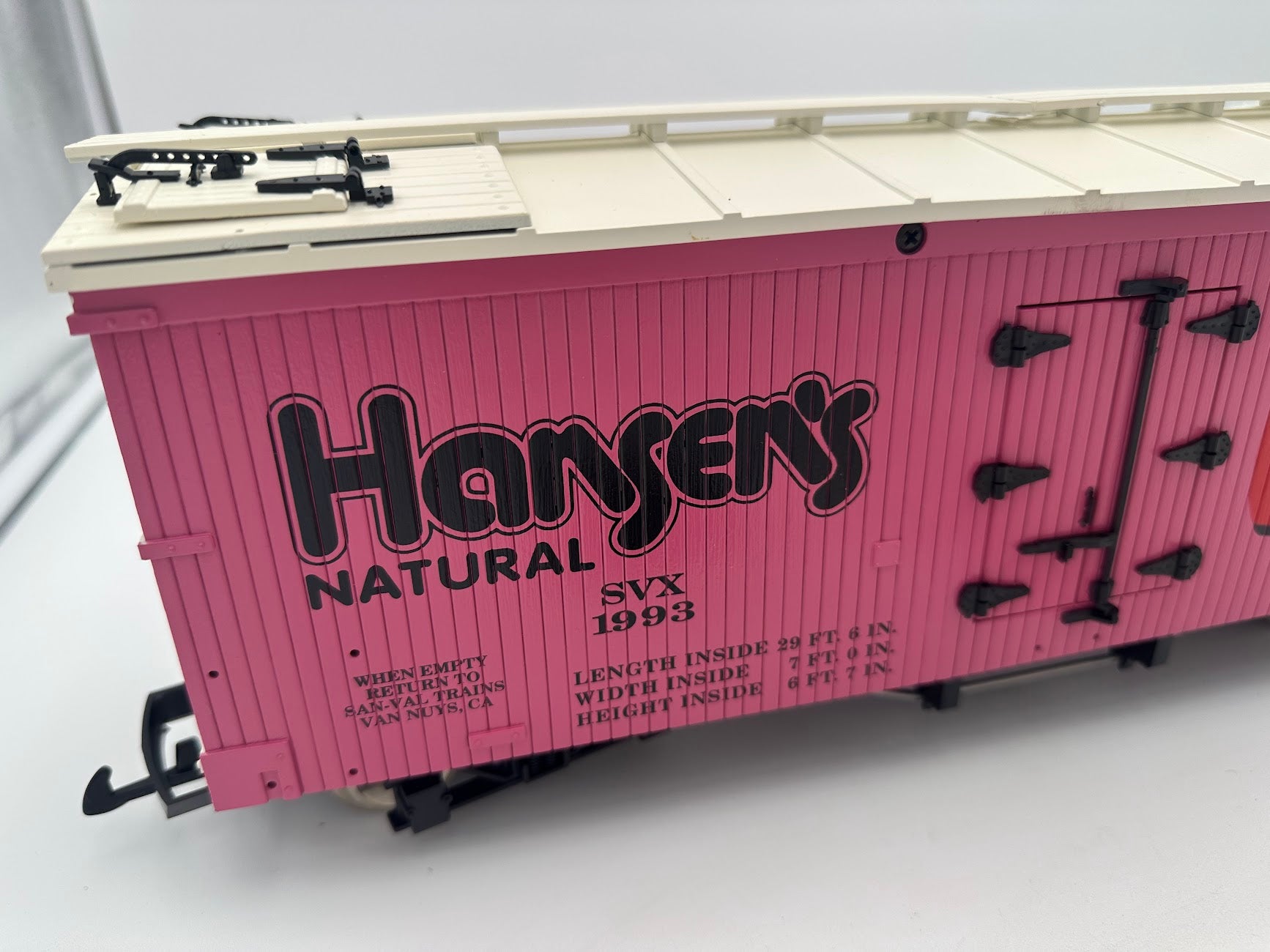 USA Trains Hansen's Natural Premium Soda RARE PINK Boxcar with Metal Wheels - Limited Run - comes exactly as pictured. This is from Al's personal collection and was on his G Scale wall display. Comes in a USA Trains Box.