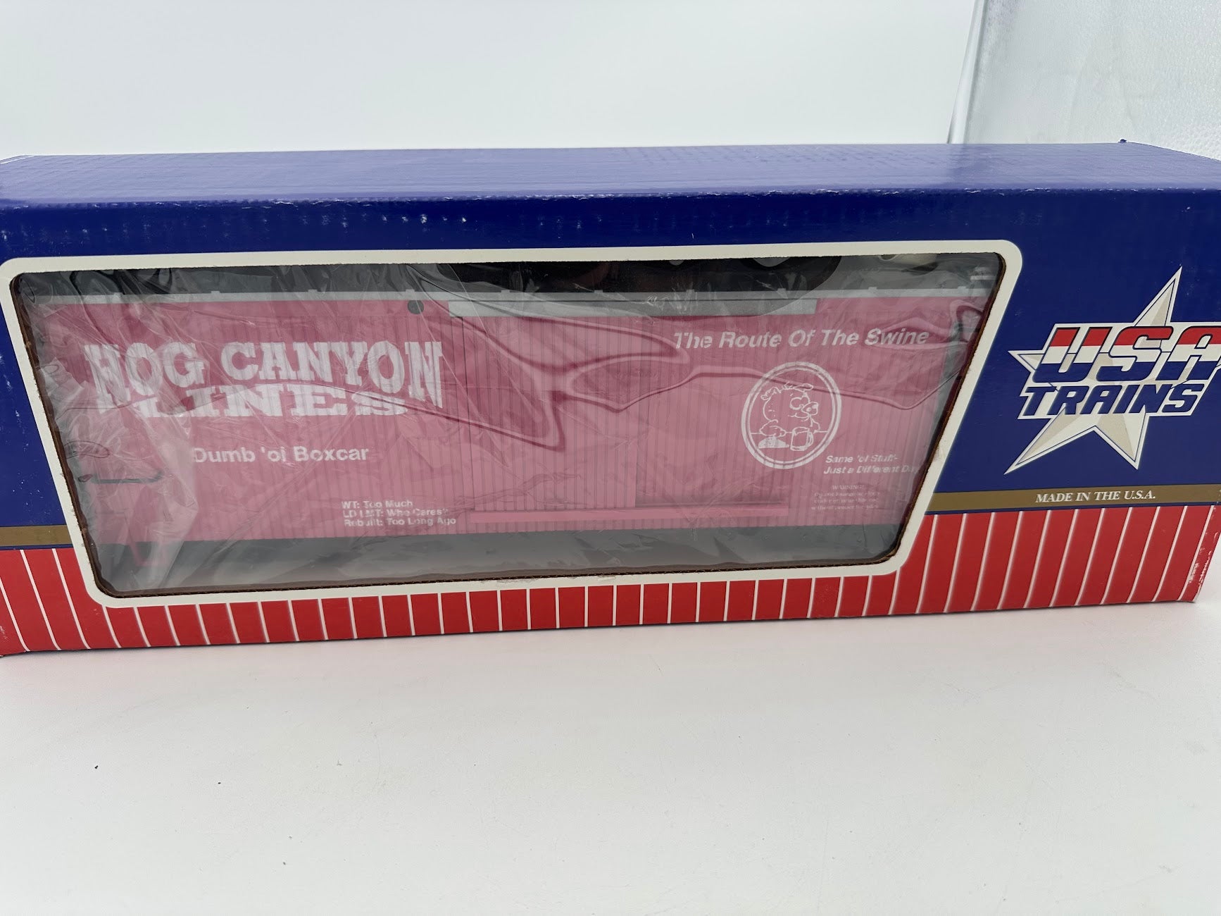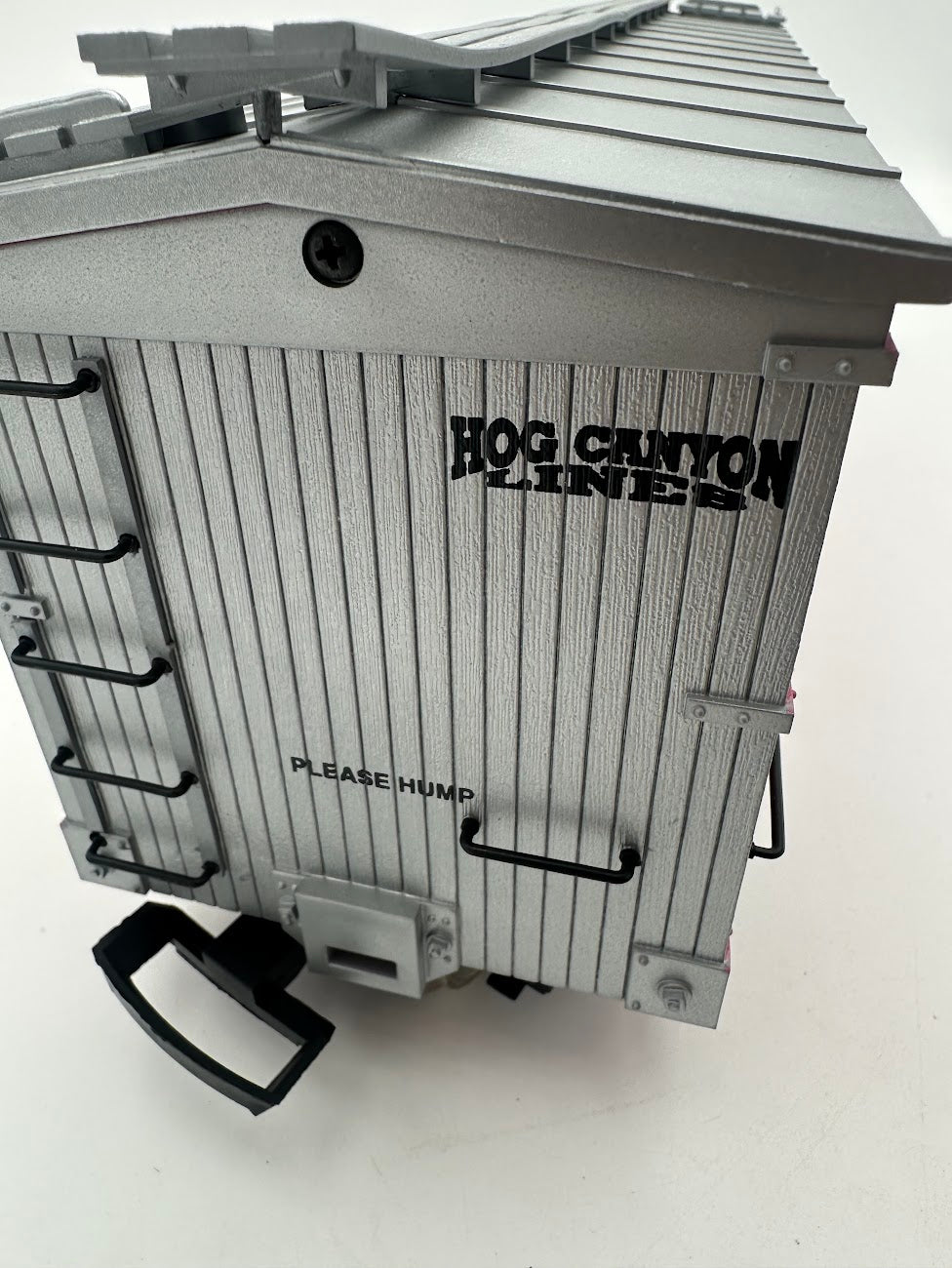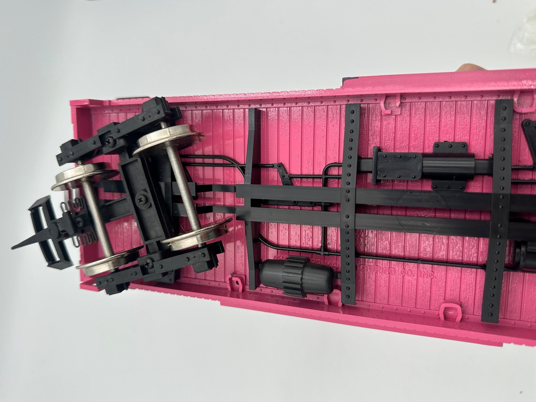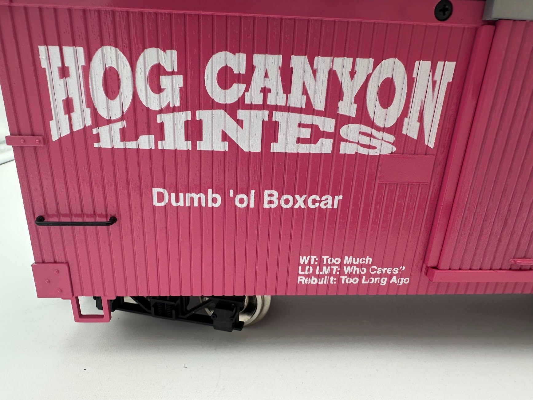 USA Trains Hog Canyon Lines Reefer PINK Boxcar with Roll-EZ Metal Wheels - Limited Run - comes exactly as pictured. This is from Al's personal collection and was on his G Scale wall display. I believe he designed this one himself and had it manufactured at USA. Comes in a USA Trains Box. Includes detail parts that are pictured.