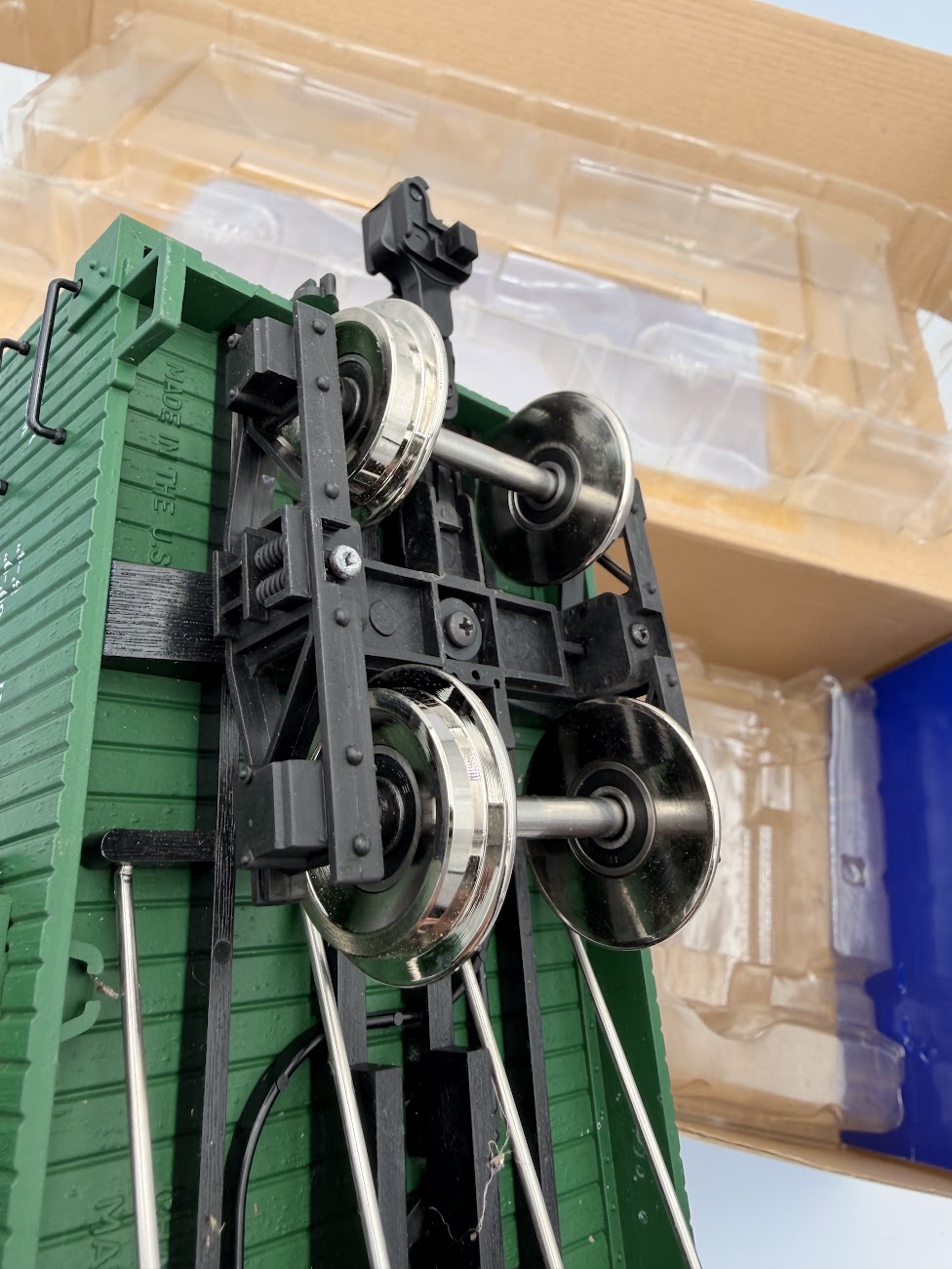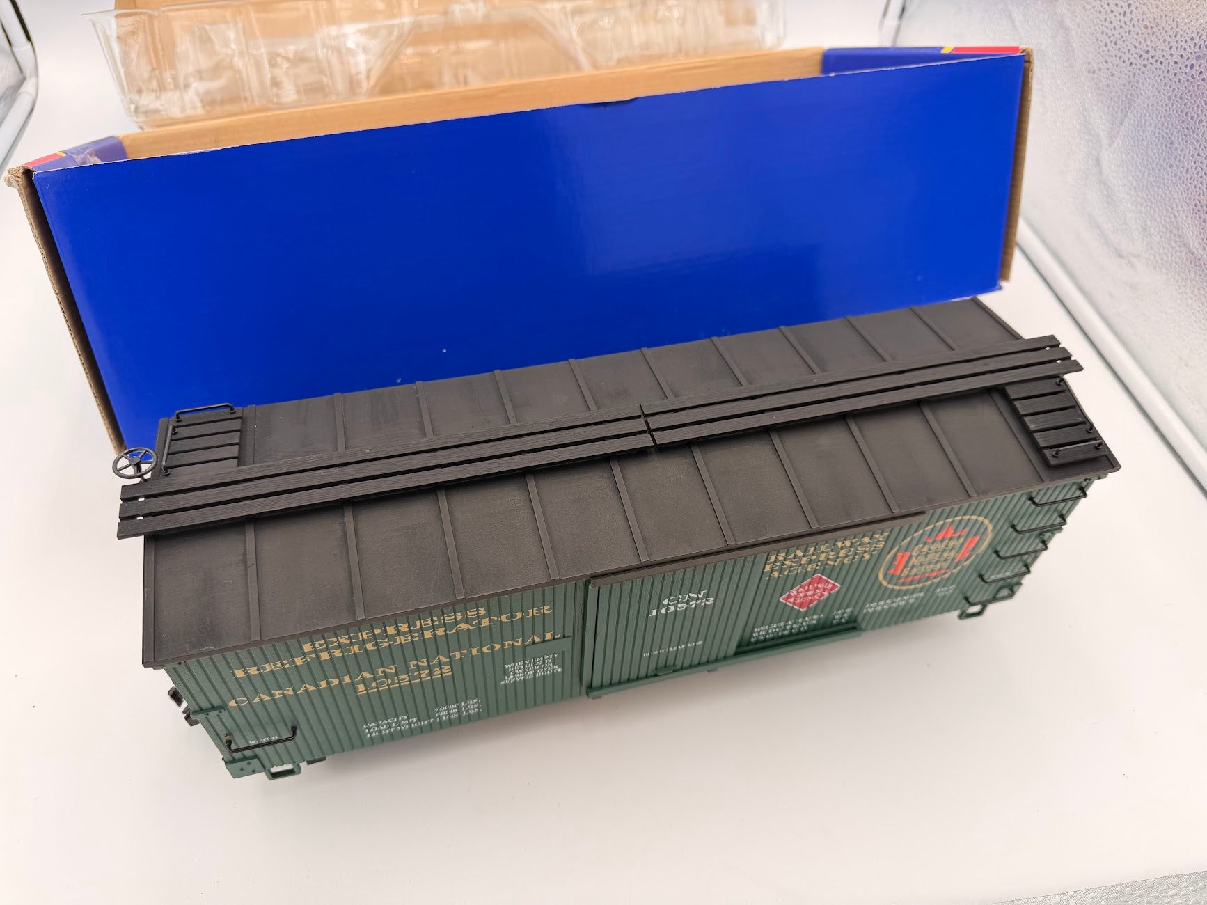 USA Trains Charles Ro Canadian National Wood Box Car with ROLL-EZ Ball Bearing Chrome Metal Wheels. Does not appear to have been run.